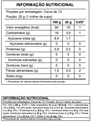 100% artesanal, sem conservante químico, sem corante, alto teor nutritivo.